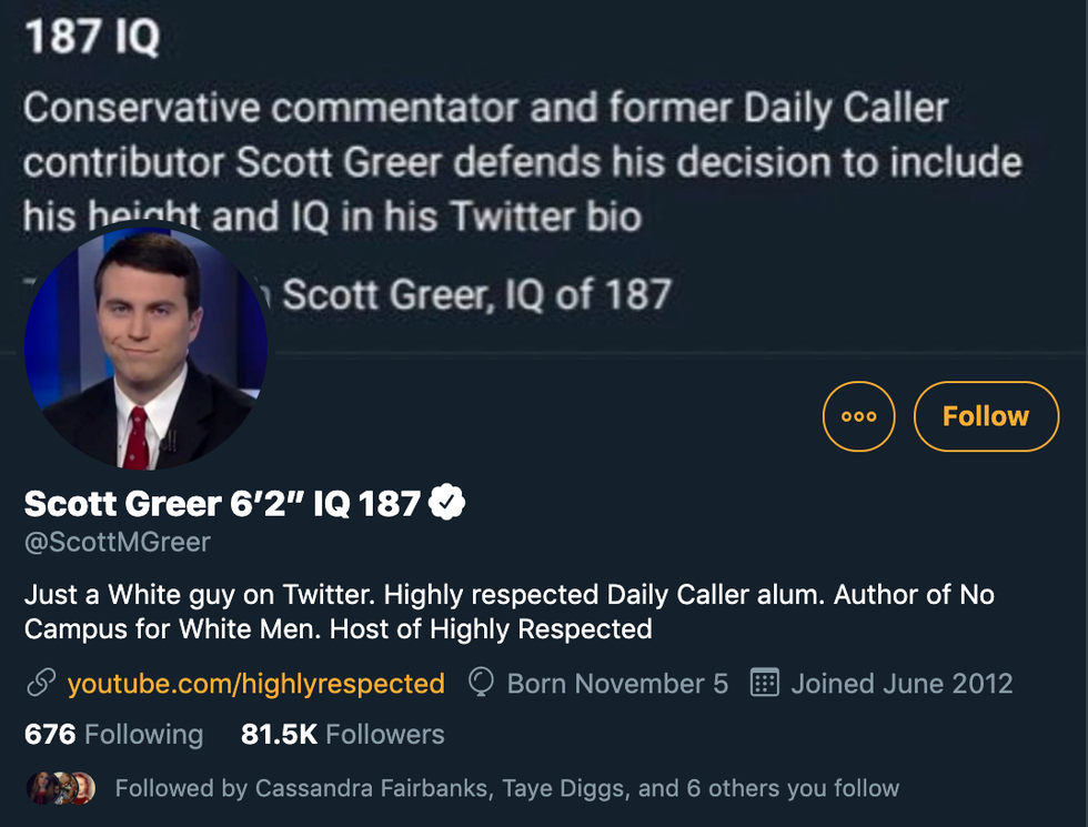 But this week, people suddenly realised that Greer’s Twitter display name included two very specific factoids, which we can only assume are meant to refer to his height (6ft 2in, apparently), and his IQ (the now-infamous 187).