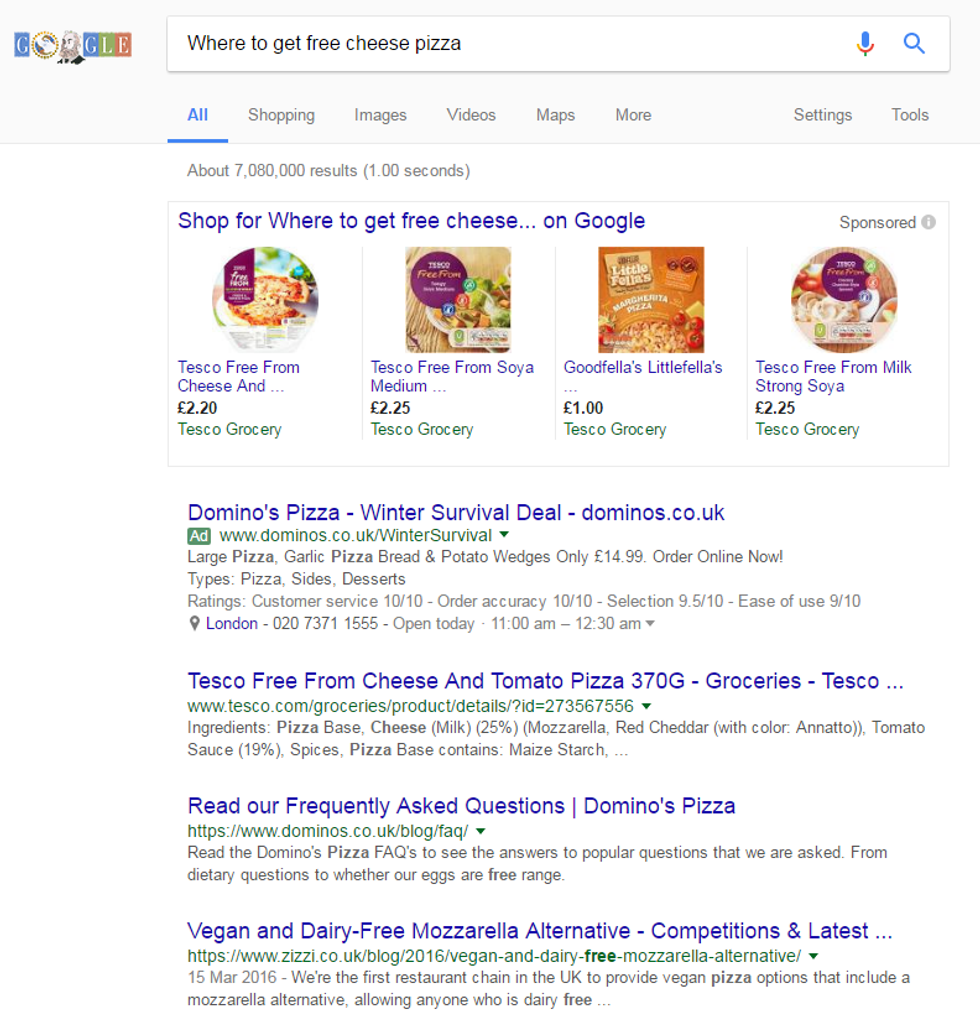 2. We searched “Theresa May” and got “Where to get free cheese pizza”: