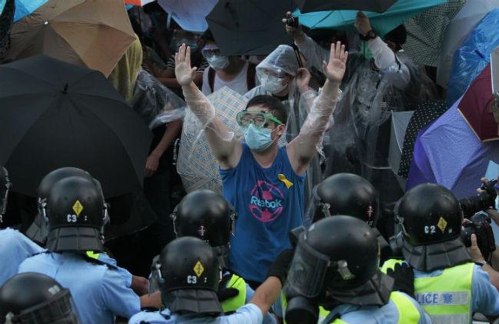 The 'hands up, don't shoot' gesture has been etched into the minds of the world by protesters in Ferguson, Missouri, where an unarmed black teenager was shot by a police officer. But demonstrators in Hong Kong are only replicating it unconsciously, having been advised by protest leaders this was the safest way to advance towards riot police.