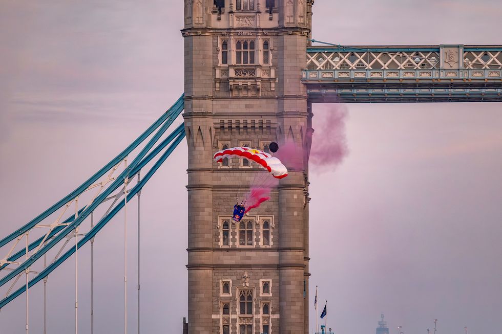 They soared through Tower Bridge and completed a complex manoeuvre known as a ‘flare,’ to rise up again to 80 metres, the height required to open their parachutes before landing safely.