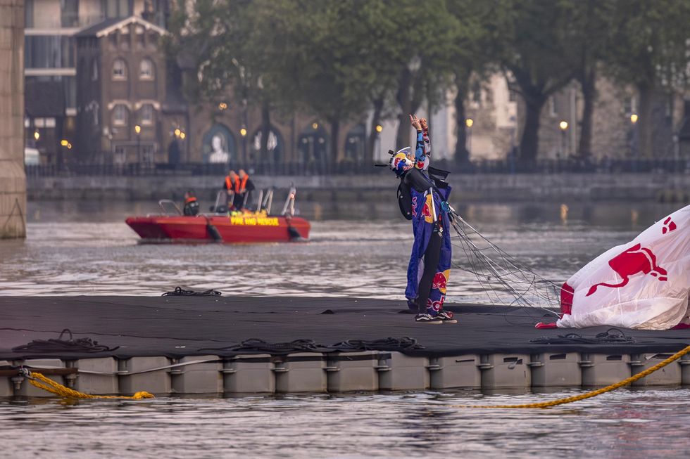 Austrian Red Bull skydivers Marco Furst, 33, and Marco Waltenspiel, 39, jumped from a helicopter at 3,000 feet high on Sunday morning, diving down to 35 metres above the River Thames.