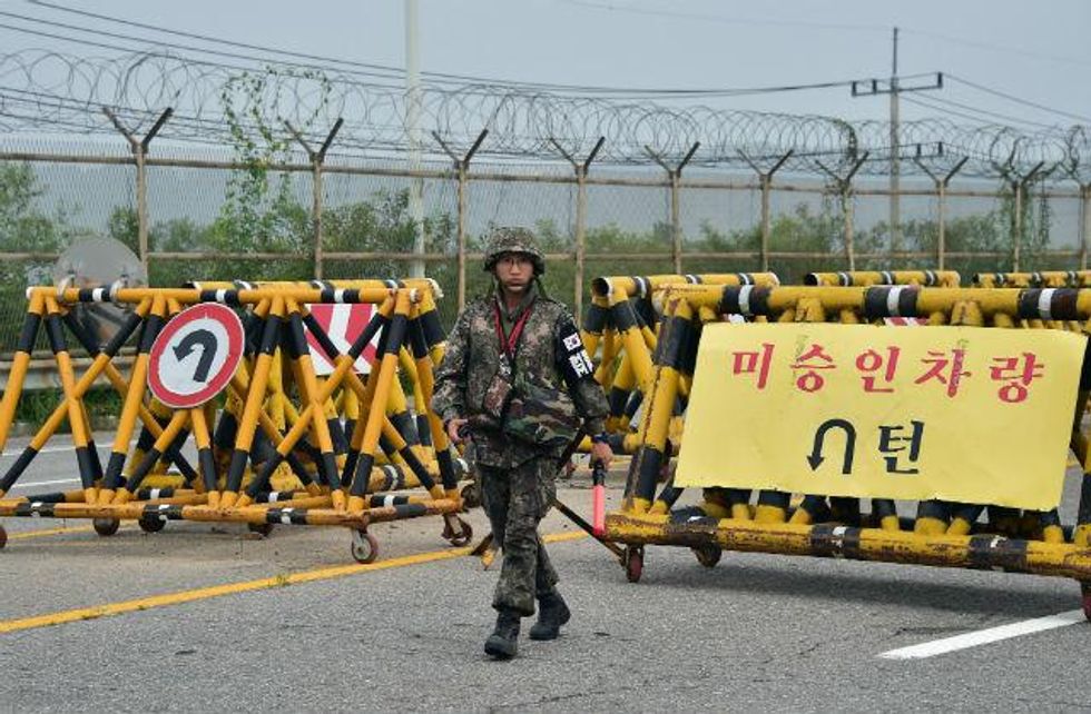 In this stock image, a South Korean soldier takes down a battery of propaganda loudspeakers on the border with North Korea on 16 June 2004 in Paju, South Korea.