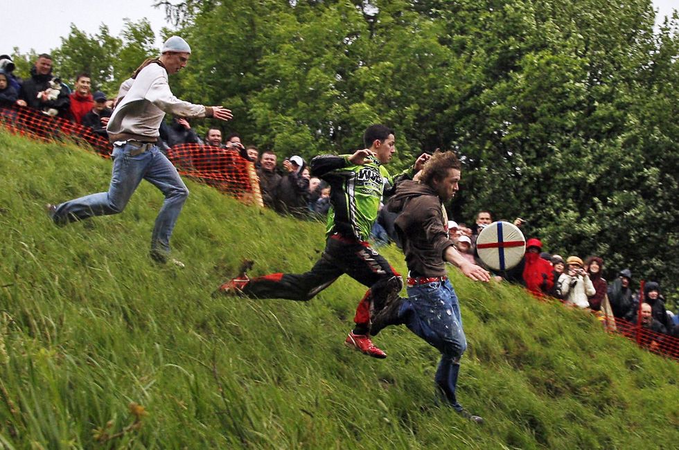 The race follows a round of Double Gloucester Cheese which is sent rolling down a hill, and competitors have to run after it, with the person over the finish line at the bottom being crowned the winner.