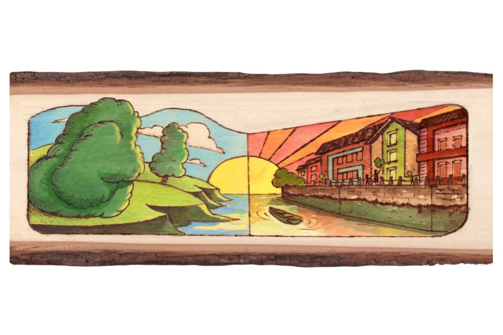 The left side of the Doodle – which was created using a wood burning technique – shows emerald cliffs dotted with huge, cumulus trees, and the right shows a town bordering the water, and a stick woman holding the hand of a child as she proudly brandishes a shamrock.