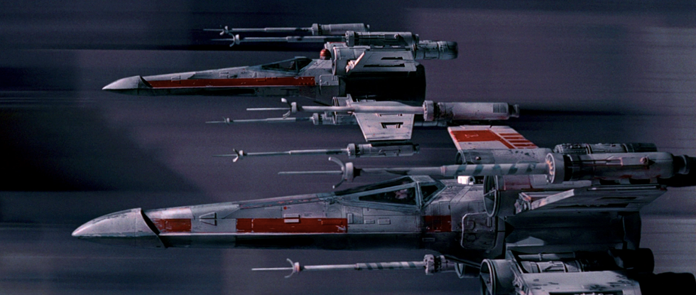 The model was made for the 1977 film Star Wars: A New Hope and used for close-up shots; it has articulating wings, working lights and is marked with battle scars. It was flown by hero Luke Skywalker in the film.