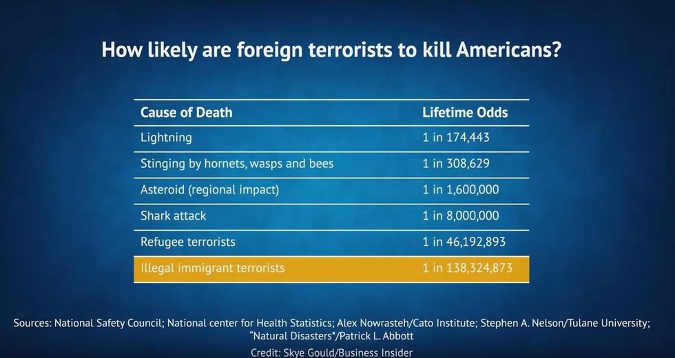 In fact, people have more chance of being killed by an asteroid than killed by a foreign terrorist.