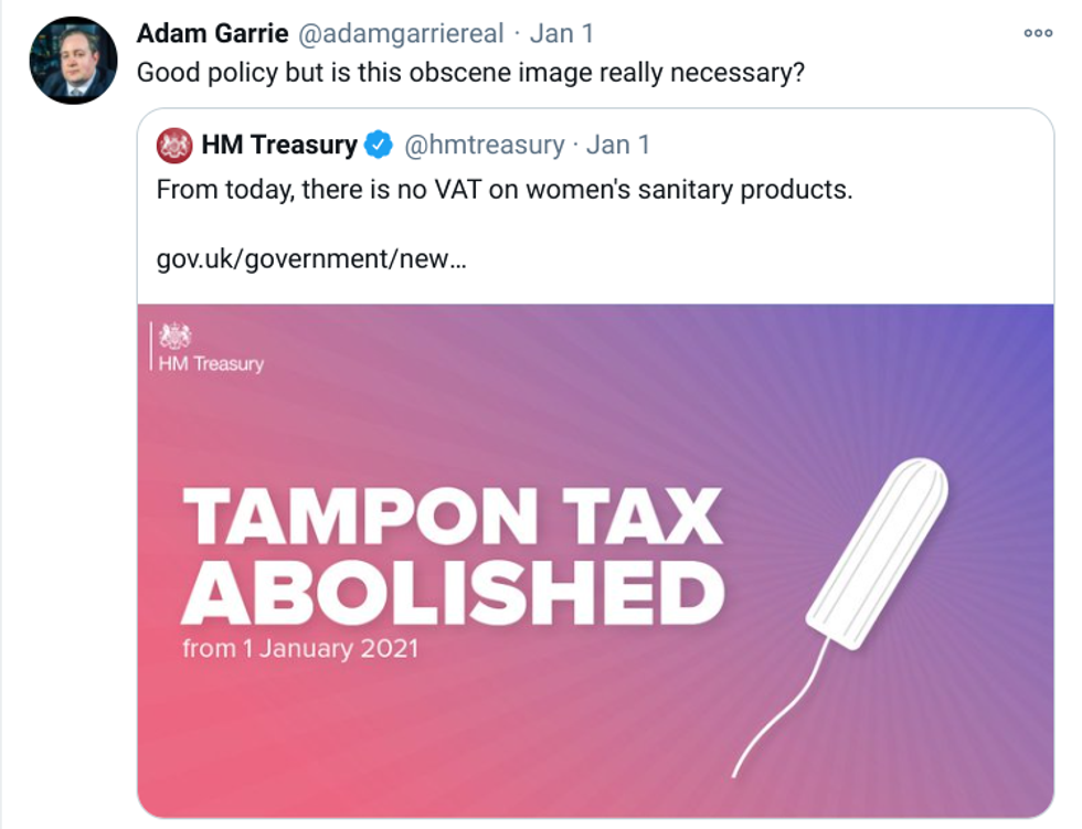 Despite the near-universal positive reaction to the tax being scrapped, and the uncontroversial nature of the cartoon of a tampon being used to depict it, radio presenter Adam Garrie tweeted that the image was “obscene”.