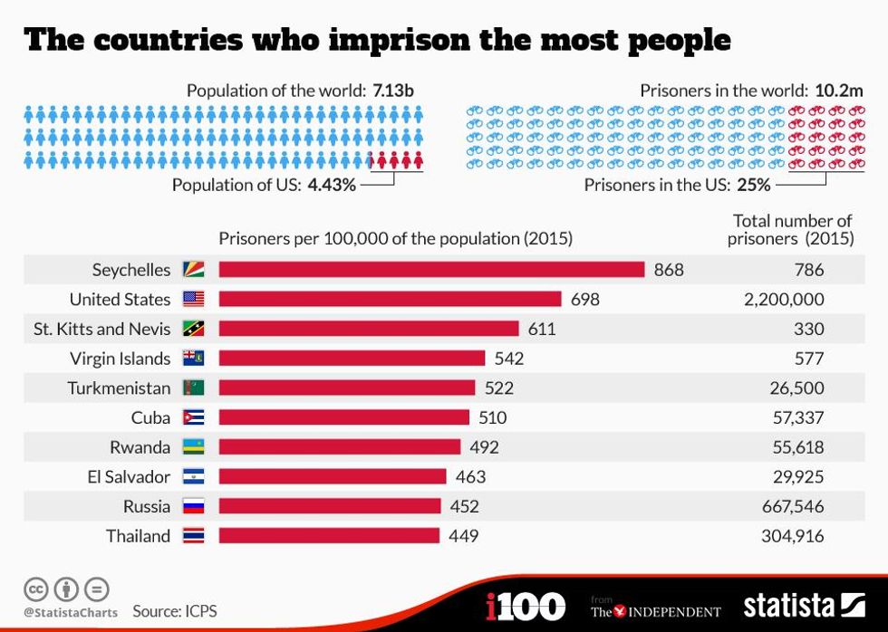 In addition, as this chart from Statista shows, 25 per cent of the world’s prisoners are based in US jails and the country has a higher ratio of prisoners than any other country in the world (apart from the small island nation of the Seychelles).