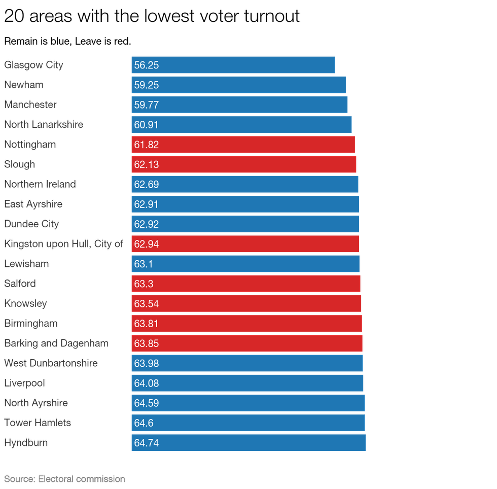 You'll note most of the low turnout areas in the top 20 were sites of Remain victories.