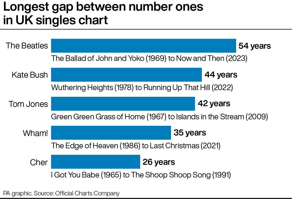 Other artists with long spells between UK number one singles include Tom Jones (42 years from Green, Green Grass of Home in 1967 to Islands In The Stream – with Rob Brydon, Robin Gibb and Ruth Jones – in 2009); Wham! (35 years between The Edge Of Heaven in 1986 and Last Christmas in 2021); and Cher (26 years between I Got You Babe – with Sonny Bono – in 1965 and The Shoop Shoop Song in 1991).