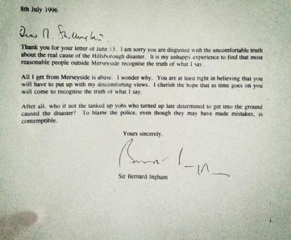 Their protests fell on deaf ears in Thatcher's office, if this 1996 letter from Ingham to Liverpool fan Graham Skinner is anything to go by:
