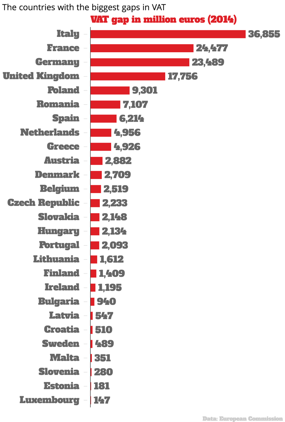 Italy is the biggest tax dodger in the EU, with 36 billion euros left unpaid on VAT.