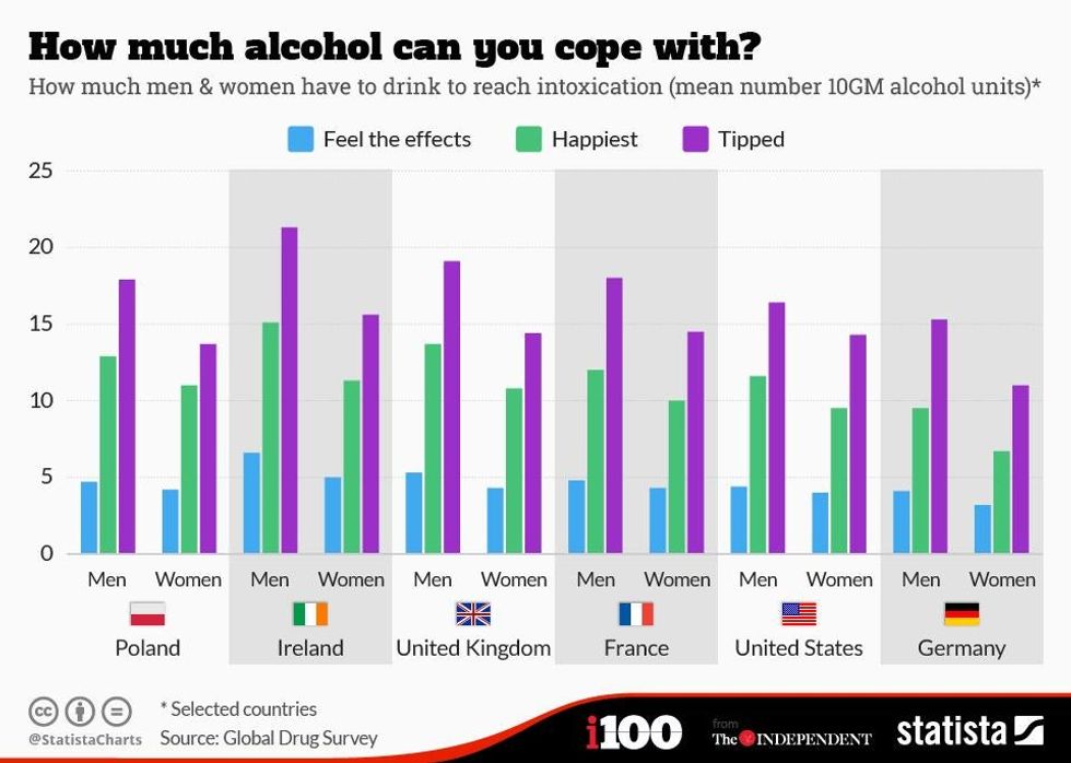 British people also show a fairly high tolerance for drink, needing more than people from countries like Germany, France and the US to "feel the effects", feel "happiest" or to be "tipped" (getting more drunk than they wanted).