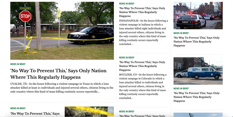 "Citizens living in the only country where this kind of mass killing routinely occurs reportedly concluded Tuesday that there was no way to prevent the massacre from taking place," the familiar sentence from the Uvalde story reads.