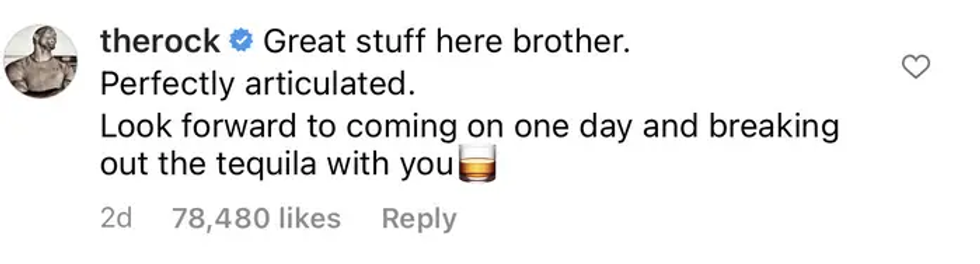 Commenting on the post, Johnson wrote: "Great stuff here brother. Perfectly articulated. Look forward to coming on one day and breaking out the tequila with you."