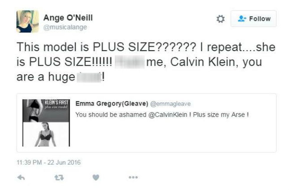 Calvin Klein never actually referred to her as "plus size" - although some magazines did - and the text with the image being shared on Twitter appears to have been photoshopped. The campaign is also from 2014...