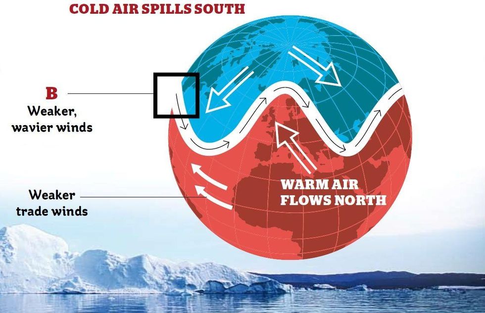 Melting Arctic ice is believed to weaken the high-altitude winds, causing wider oscillations and "standing waves".