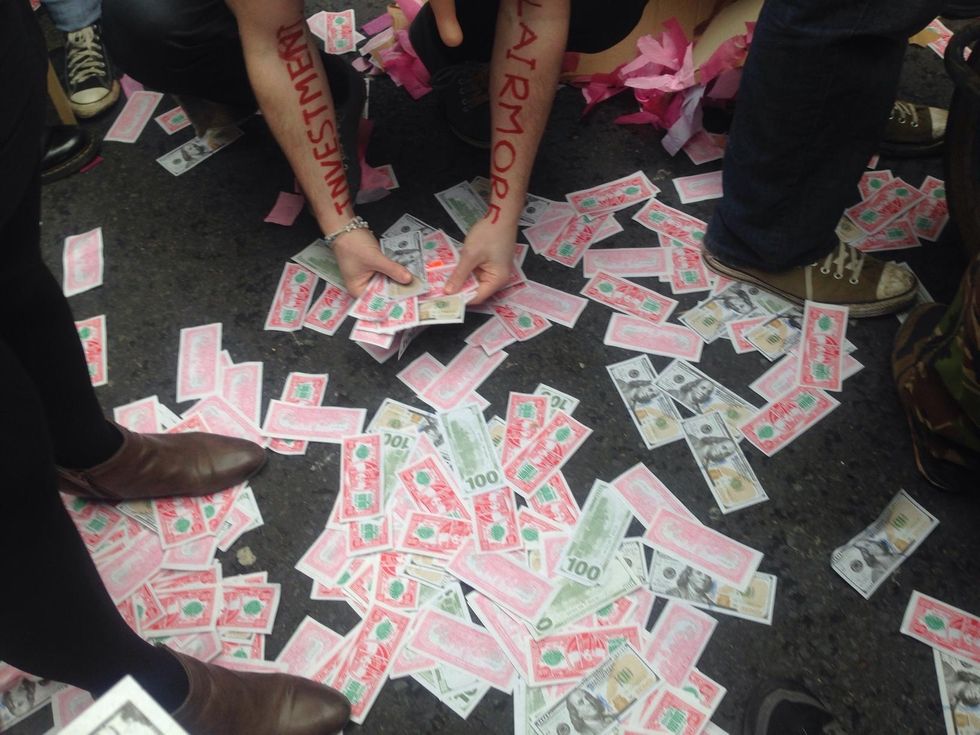 When smashed open the piñata was full of fake money which spilled out onto the streets.