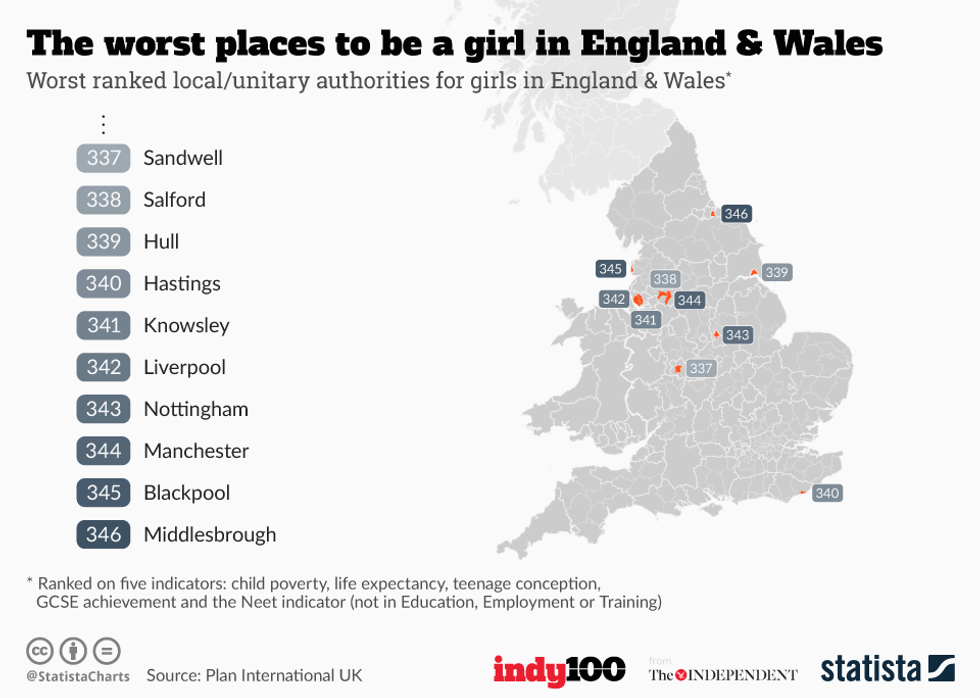 The below map from Statista shows the ten worst areas to grow up as a girl: