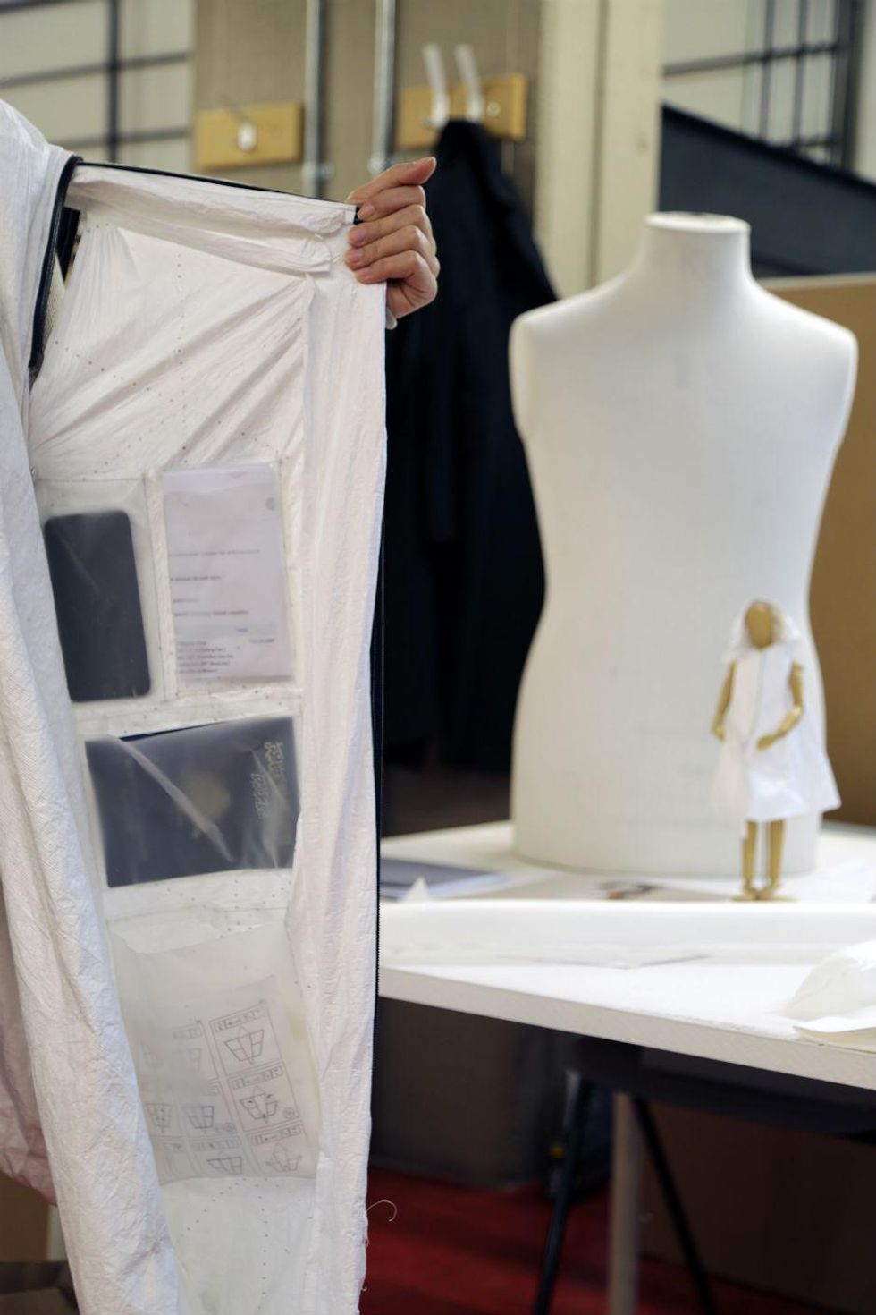 The Wearable Habitation coat is made of a thin, waterproof material called Tyvek and lined with Mylar - a material used to provide extra insulation.
