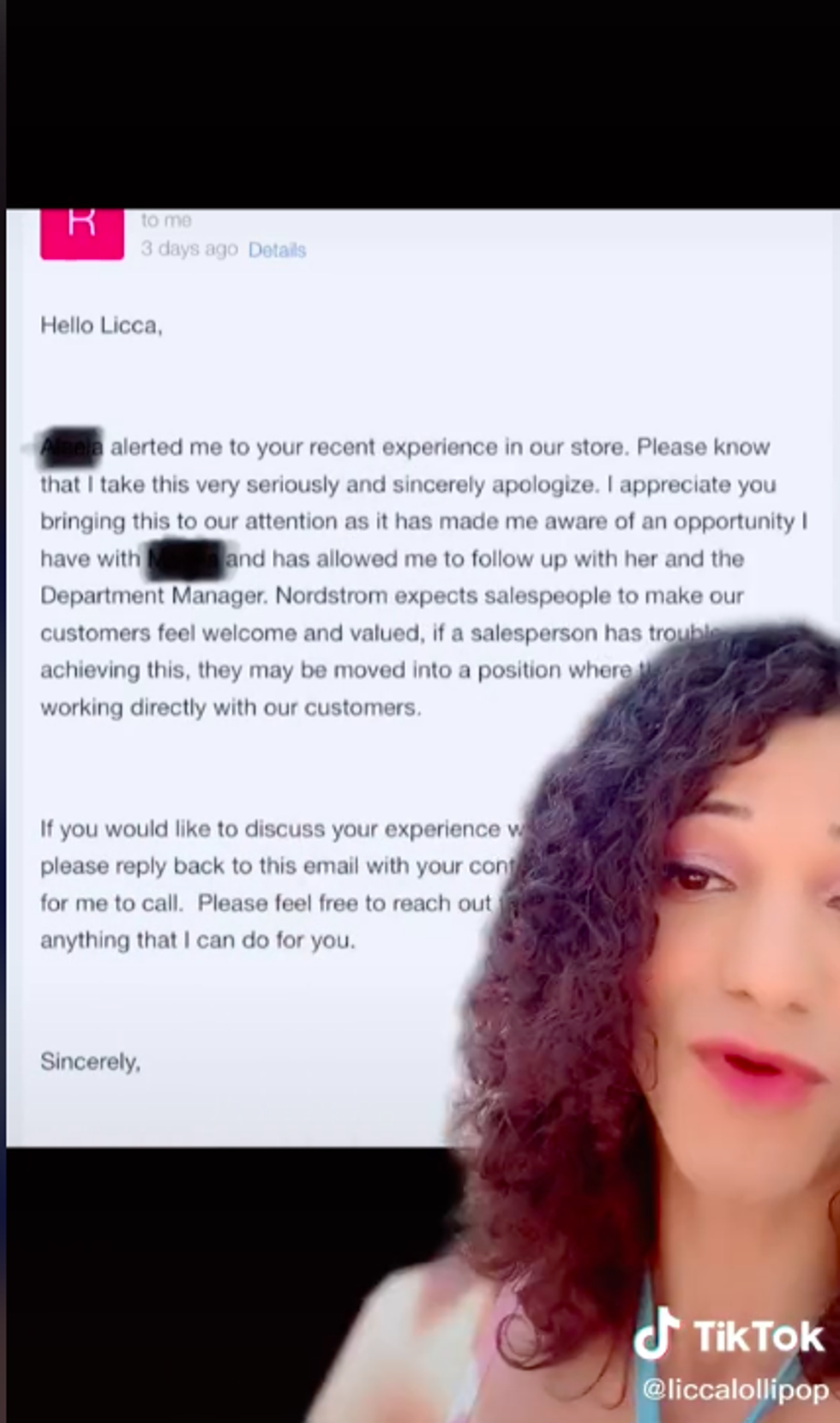 On TikTok, a user named Licca said she went to Nordstrom, an American department store but was snubbed by an employee who told her to find someone else to help her when she tried to exchange an item.