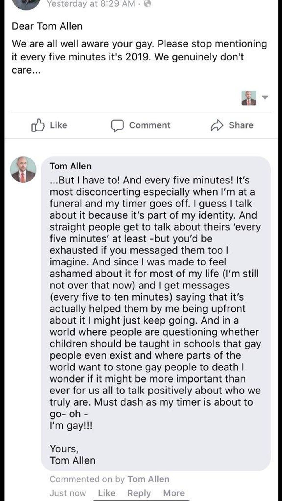 This was made apparent when comedian Tom Allen shared a comment he’d received on Facebook. It read:
