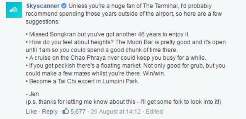 Skyscanner's employee, known only as "Jen" responded... in a quite unexpected way. Instead of giving a polished, PR-friendly apology, she quickly recommended things to do, including a river cruise and the floating market.