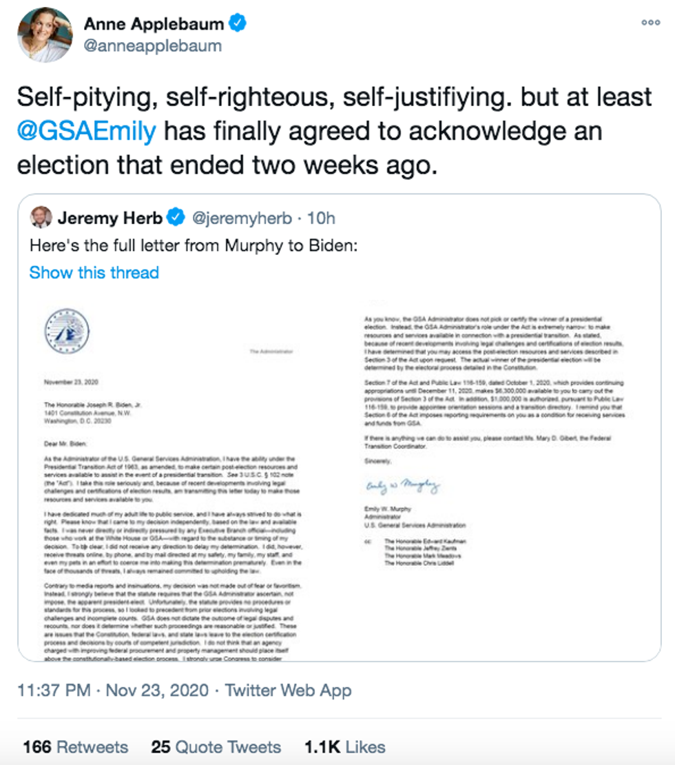 The letter in which Emily Murphy, the General Services Administration chief responsible for authorising the transition process, gave the go-ahead was also criticised for being begrudging and not referring to Biden as president-elect.