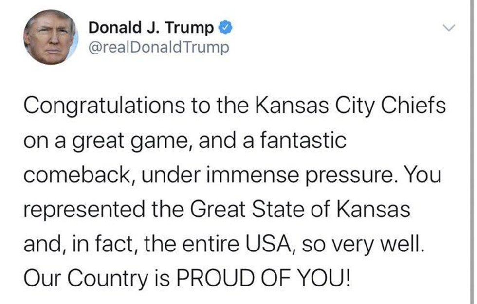 In a now-deleted tweet, the president told the Kansas City Chiefs that they "represented the Great State of Kansas, and in fact, the entire USA, very well."