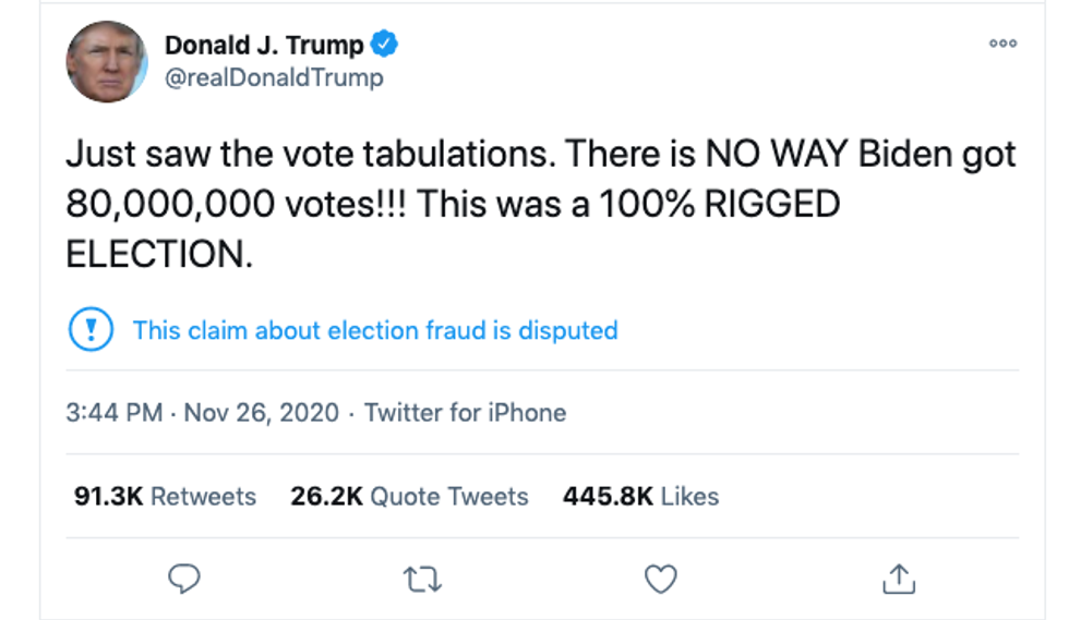 Trump continued to cry foul about the election. In a tweet filled with capital letters and exclamation marks, he wrote: “This was a 100% RIGGED ELECTION.” Given that there isn’t evidence for this bold claim, Twitter once again added a disclaimer. Under the tweet, it says: “This claim about election fraud is disputed.”