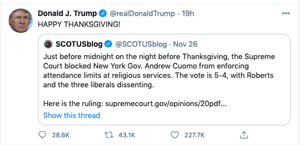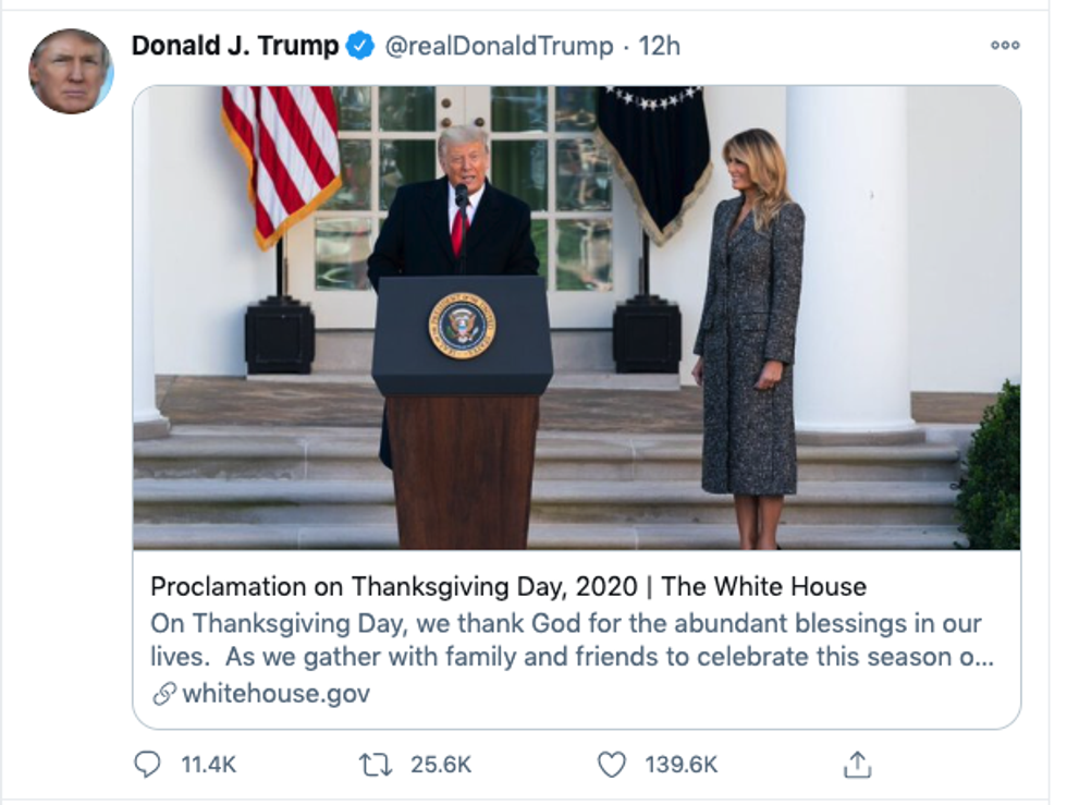 Finally, Trump got round to wishing people a happy thanksgiving. Well, sort of. He tweeted it alongside a post about Andrew Cuomo being blocked from enforcing attendance limits on religious services.