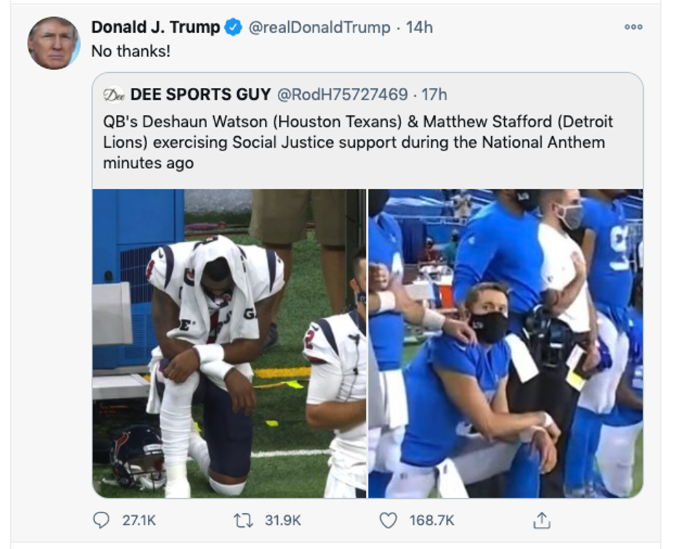 He then decided to respond to a tweet about NFL players taking the knee. For the last few years, some American athletes have done this to show their support for the Black Lives Matter movement. Trump quote-tweeted it and simply said: “No thanks!”