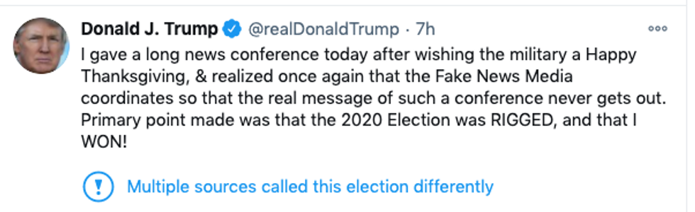 He once again claimed that the election was “RIGGED” and that he “WON”. Because this isn’t true, Twitter added: “Multiple sources called this election differently.”