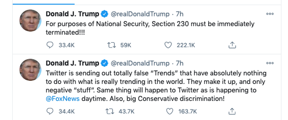 Trump then accused Twitter of “big Conservative discrimination”. He was particularly upset with #diaperdon trending on Twitter. So much so that called for Section 230 to be revoked – a rule that protects social media platforms from getting in trouble for content published by users.