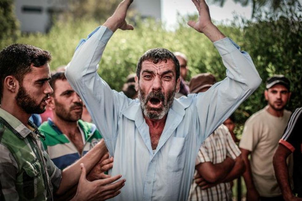 Claim 5: A Palestinian man tears his shirt after being told his son was killed in a shelling attack upon a beach in Gaza
