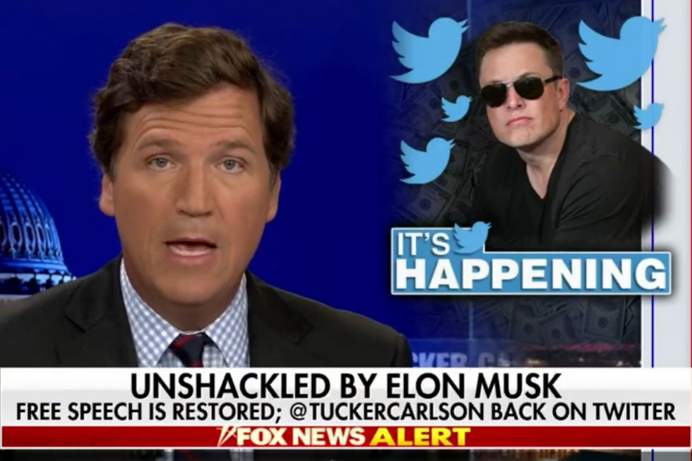 During his Tucker Carlson Tonight show, a chyron appeared at the bottom of the screen reading: “UNSHACKLED BY ELON MUSK: FREE SPEECH RESTORED; @TUCKERCARLSON BACK ON TWITTER.”