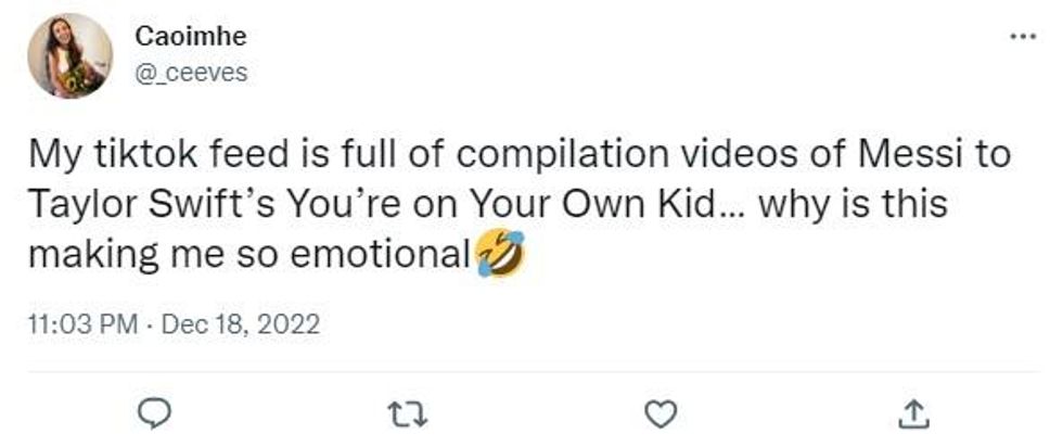 Now, we can't confirm if Messi is a Swifie but it looks like their fanbases have been commemorating the achievement of the world's greatest player by editing clips together throughout his football career to Swift's reflective track You're on Your Own, Kid from her recent record-breaking album Midnights.