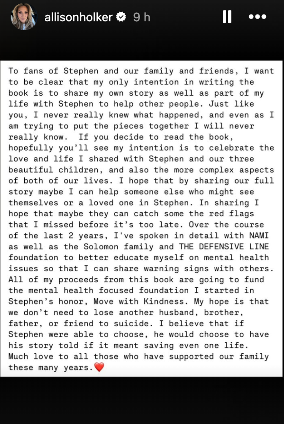 Holker said her "only intention" was to share her "own story as well as a part of my life with Stephen to help other people".
