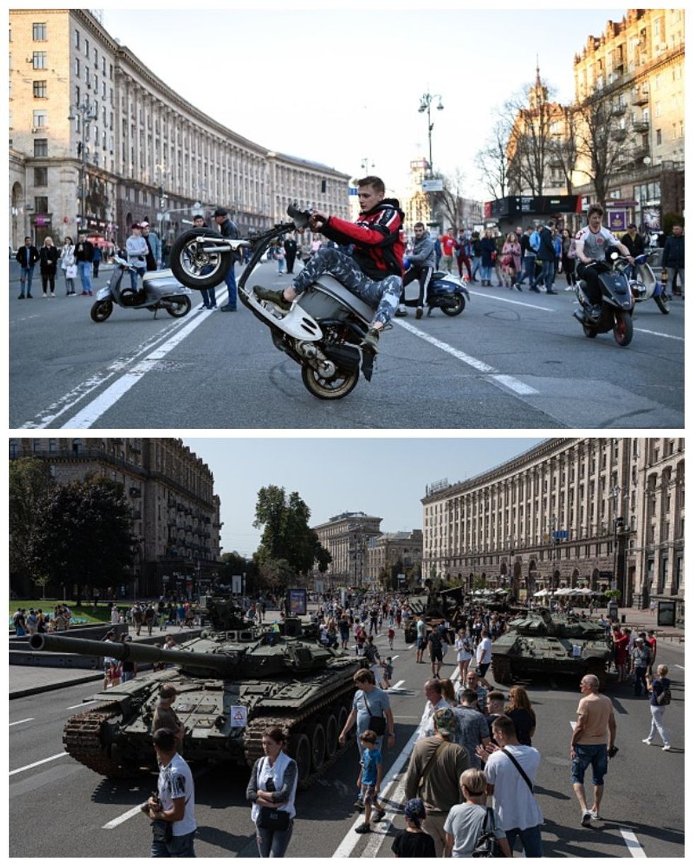 The first photo shows a young man riding an electric scooter in 2019 in downtown Kyiv, shortly before the country voted for President Volodymyr Zelensky.