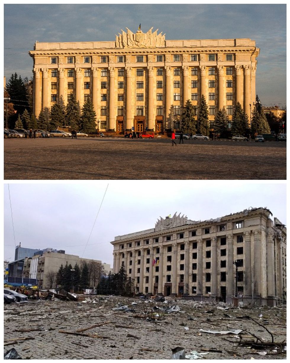 To understand the scope of the damage and loss Russia has caused we’ve compiled several photos that show how Ukraine appeared before 24, February 2022 and after.