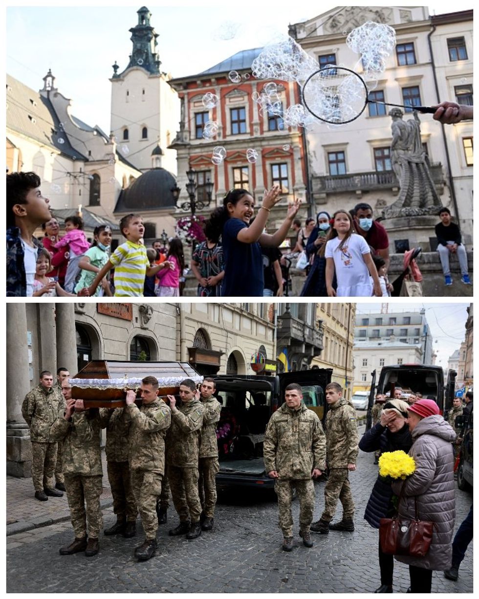 In the first photo, taken in Lviv, the largest city in western Ukraine, in August 2021, children are playing in the streets joyfully.