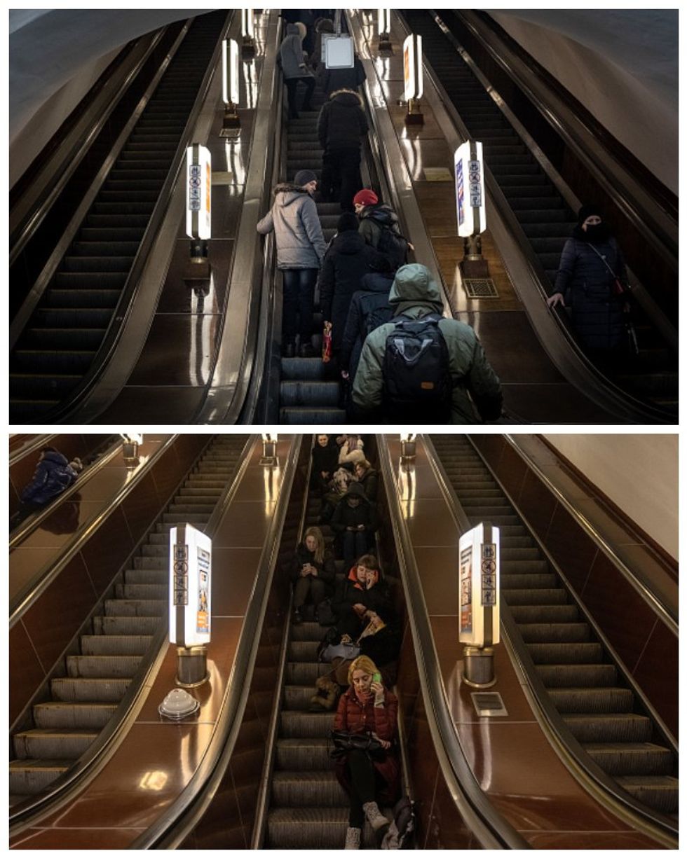 The first photo was taken more than a month before the invasion in January 2022. It shows people using the escalator to exit and enter the Kyiv subway.
