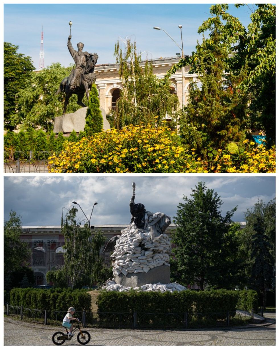 But the below photo, taken in June 2022, shows how Ukrainians are trying to protect their monuments from bombings- by stacking sandbags around them. The monuments are no longer totally visible to the public as municipal workers try their hardest to prevent them from being destroyed.