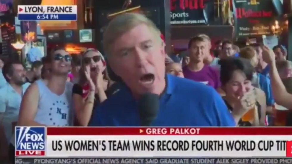 play icon US football fans chant 'f*** Trump' during live Fox News broadcast from World Cup victory party