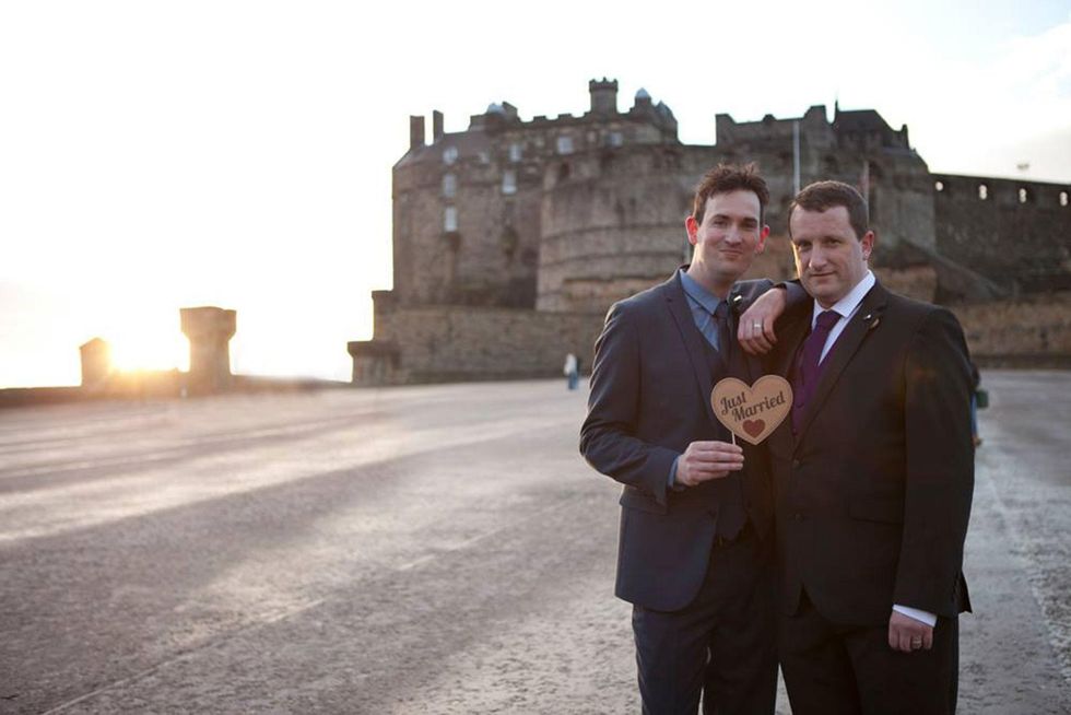 Tom Lanting, 34, and Iain Robertson, 39, have been together for 12 years and on Sunday they had a wedding in Marlin's Wynd in Edinburgh that included such pagan traditions as handfasting (where hands are bound together), sharing of mead, and jumping the broom.
