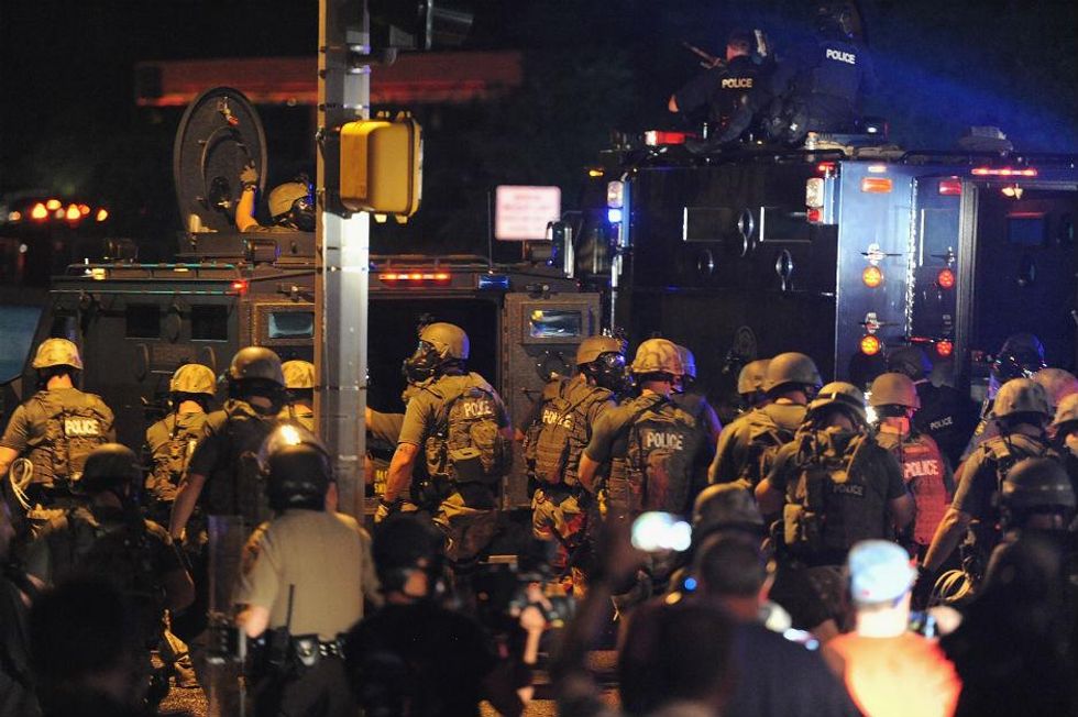 Police officers prepare to disperse demonstrators during a protest on West Florissant Road.
