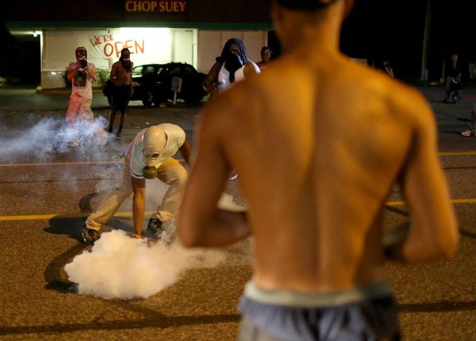 Police officers fire canisters of tear gas on protestors as they try to flee from West Florissant Road.