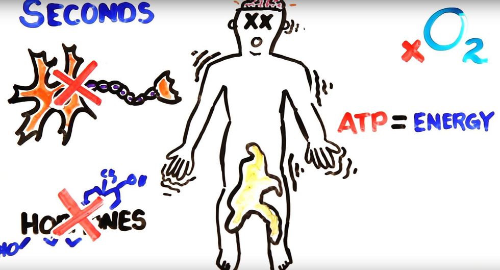 The last bit of oxygen in your body is used up, and brain activity ‘surges’ briefly as neurons stop working and the brain stops secreting hormones that regulate body function.