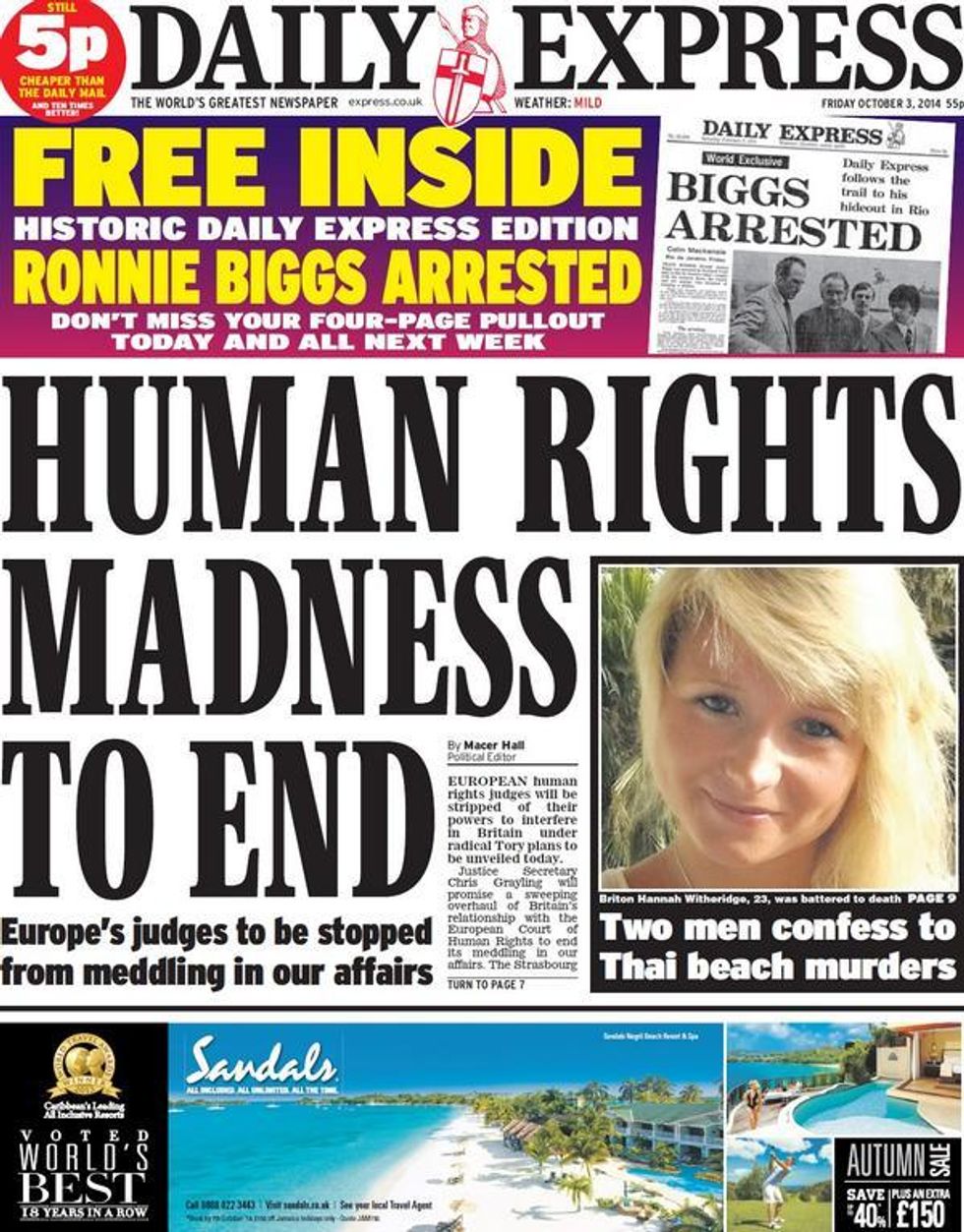 The plans for a British Bill of Rights, which will be detailed in a draft bill due to be published before Christmas, were welcomed by the Daily Express with this headline.