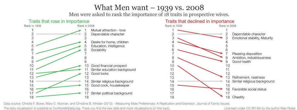 Roser used data from surveys by Christie F. Boxer to compare the importance of traits like education and intelligence for spouses from 1939 and 2008.
